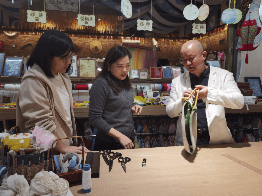 工作室团队参观企业方的草房布艺展区,深入了解了11项特色布艺技艺,对其深厚的工艺底蕴与创新表达形式给予高度评价。我校校长助理、工作室领衔人李榕玲表示,后续合作将充分发挥工作室的数字技术优势,为非遗布艺的保护、传播与创新发展赋能,让传统布艺技艺在数字时代焕发新活力。