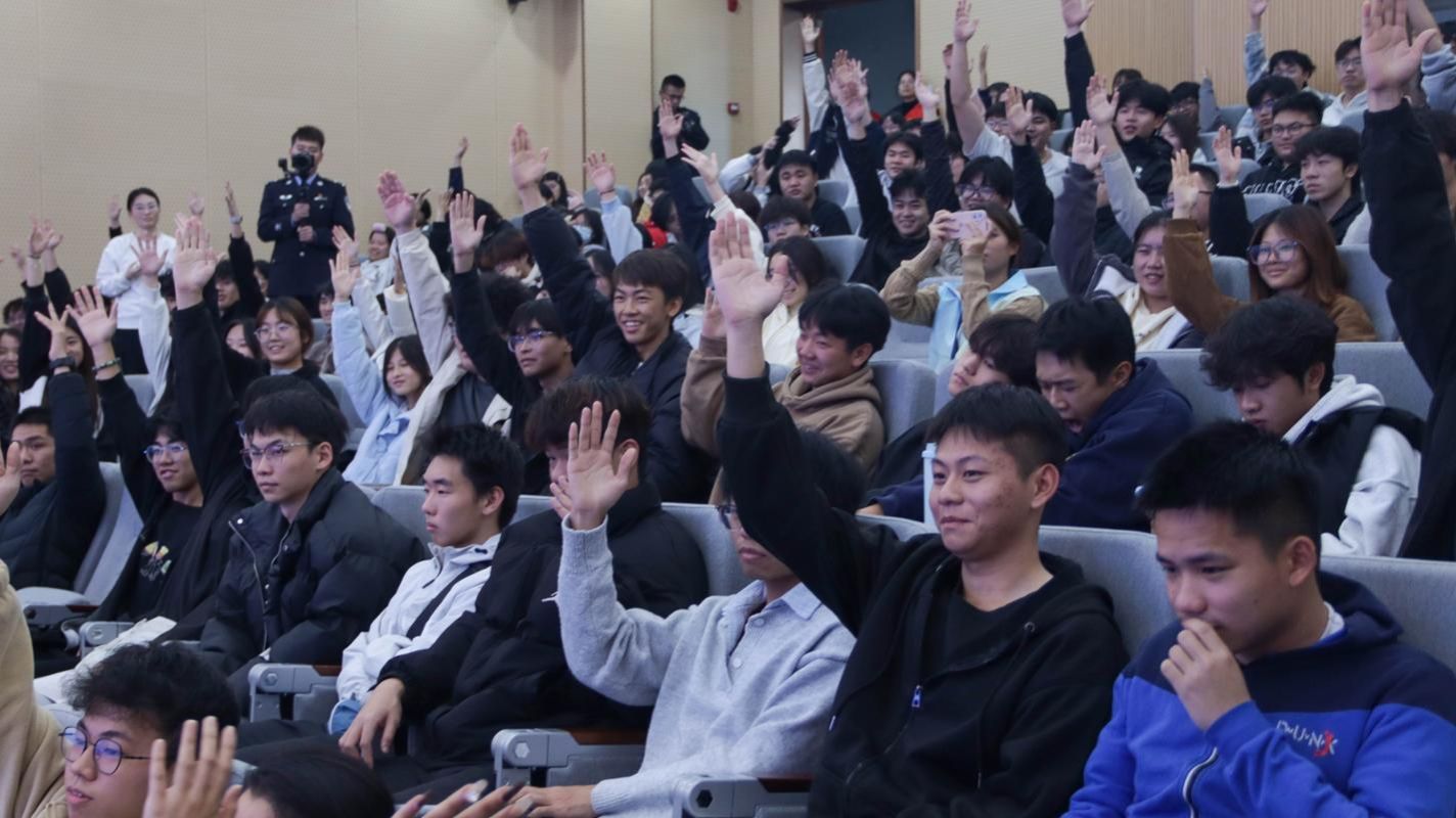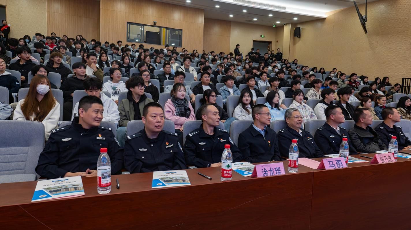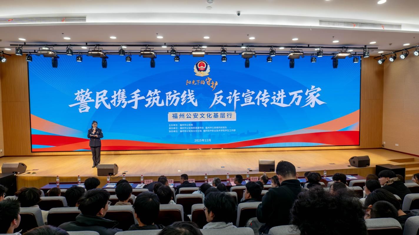 为持续推进校园反诈宣传教育走深走实,切实提升广大师生防范电信网络诈骗的意识和能力,共同筑牢校园安全防线,2025年12月23日,“阳光下的守护”警民携手筑防线 反诈宣传进万家暨福州公安文化基层行活动在我校图书馆八楼报告厅举办。福州市公安局新闻宣传处处长张乃忠、福州市公安局长乐分局政委陈雄、长乐分局刑侦大队大队长涂龙瑞、阜山海防派出所所长池振忠等领导出席活动,学校党委书记马勇、党委副书记林艺勇陪同,各学院师生代表共同参与这场反诈宣传盛会。