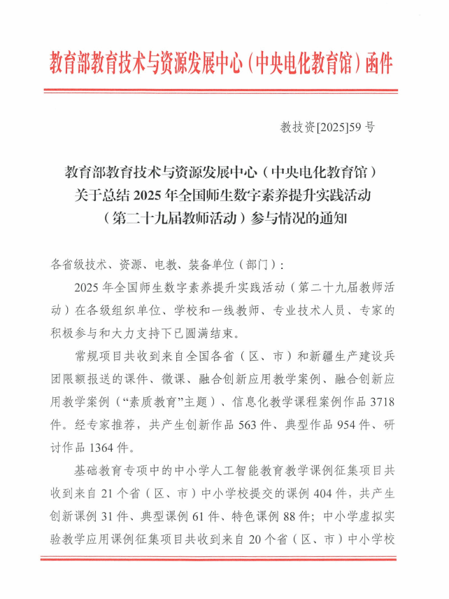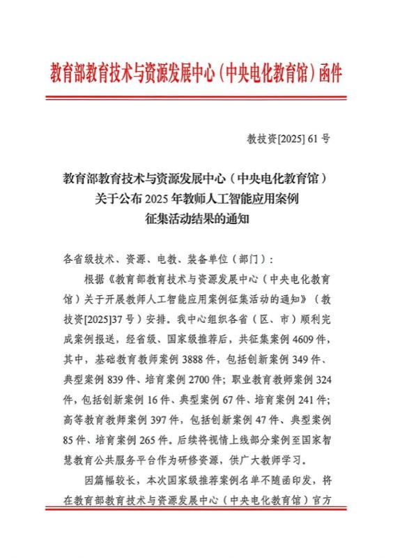 近日,教育部教育技术与资源发展中心(中央电化教育馆)主办的2025年全国师生数字素养提升实践活动(第二十九届教师活动)与2025年教师人工智能应用案例征集活动结果相继公布,我校多项成果入选,既是对教师数字教学能力与创新实践的认可,也是学校推动“数转智改”进程中具有标志意义的阶段性成果之一。