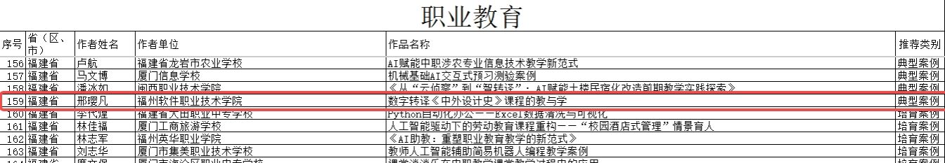 我校游戏产业学院邢璎凡老师申报的《数字转译<中外设计史> 课程的教与学》成功获评2025年教师人工智能应用案例职业教育类典型案例。该案例聚焦职教文化艺术类课程“理论抽象、学用脱节”的教学痛点,以“数字转译”为核心,依托智能教学平台生成 AI 知识图谱、精准研判学情,借助 AI 工具搭建实践创作载体,构建起 “AI + 教-学”协同育人模式,为同类课程的AI赋能教学改革提供了可借鉴、可推广的实践范式。
