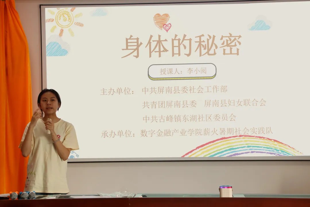 为守护少年儿童的身体成长与自我认知,近日,由中共屏南县委社会工作部、共青团屏南县委、屏南县妇女联合会、中共古峰镇东湖社区委员会主办,数字金融产业学院薪火暑期社会实践队承办的“身体的秘密”生理教育课堂,在屏南县古峰镇东湖社区党群服务中心温情开讲。