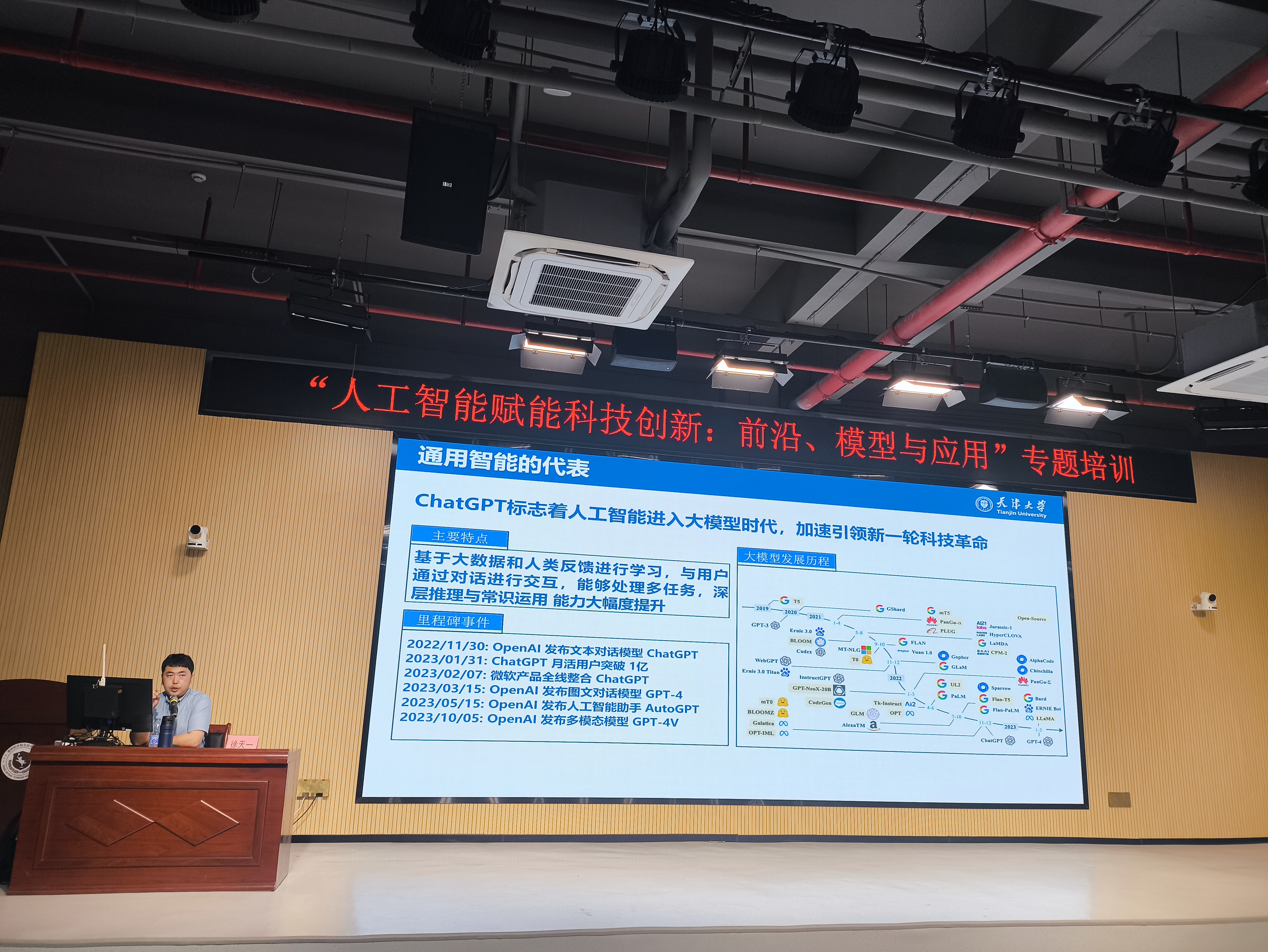 2025年5月23 日, 继 “数智赋能人才培养” 系列活动后,福州软件职业技术学院未来技术产业学院再度聚焦人工智能前沿,主办 “人工智能赋能科技创新:前沿、模型与应用” 专项培训。天津大学智能与计算学部高级工程师徐天一应邀担任主讲嘉宾,以技术演进脉络为轴,结合多领域应用案例,为在场教师代表及行业专家勾勒出人工智能与产业融合的全景图谱。