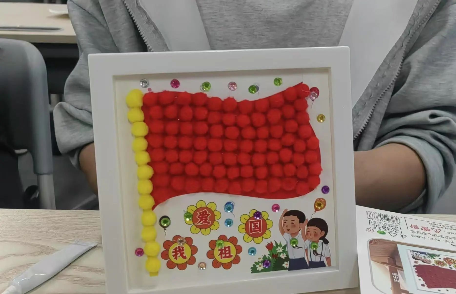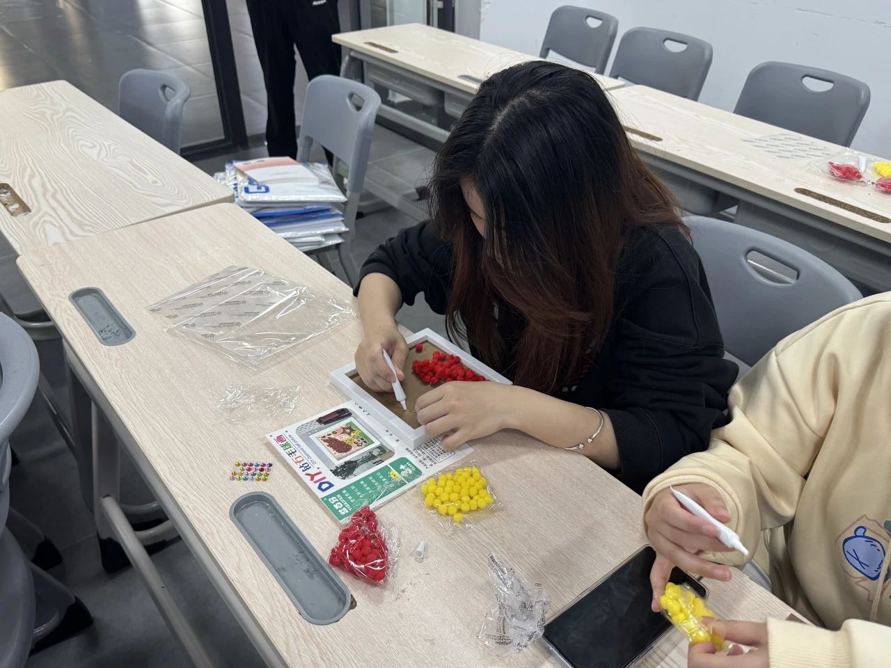 本次毛球画制作,学生党支部准备了雷锋画像和国旗等具有特殊意义的模板。在制作过程中,同学们全神贯注,小心翼翼地拿起毛球,仔细比对模板,认真涂抹胶水,将一颗颗毛球精心粘贴在相应位置。有的同学遇到毛球不易粘贴的问题,立刻向身边同学请教,大家互相帮助,共同攻克难题;有的同学则充分发挥自己的创意,在遵循模板的基础上,巧妙地调整毛球颜色搭配,让作品更具个性。