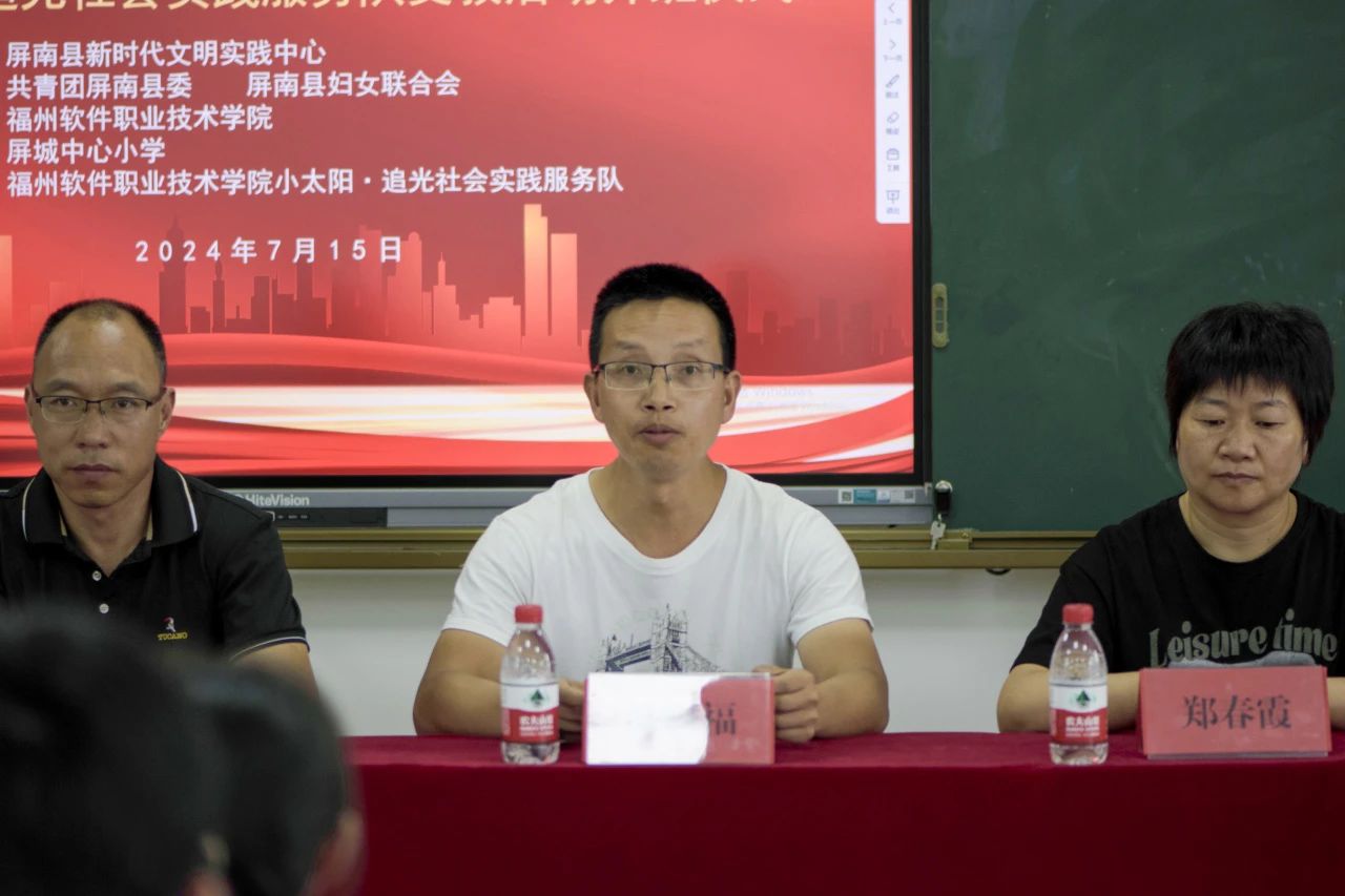 为深入学习贯彻习近平新时代中国特色社会主义思想和党的二十大精神。福州软件职业技术学院2024年暑期“七彩假期”文明实践活动暨小太阳·追光社会实践服务队支教活动开班仪式于2024年7月15日下午,在宁德市屏南县屏城中心小学举行。参加此次开班仪式的领导有共青团屏南县委副书记吴赐福、屏南县妇联主任郑春霞、屏南县文明办李声峰、福州软件职业技术学院团委副书记张玉梅、屏城中心小学张慧娟老师、谢梅花老师、50多名学生以及全体小太阳追光社会实践服务队队员。