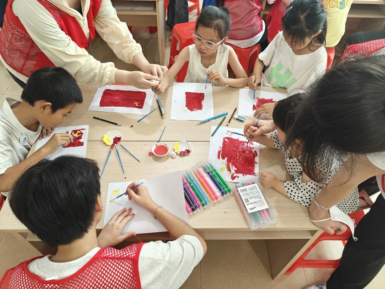 没有共产党就没有新中国。学生党员及入党积极分子们带领小朋友手持画笔,调整色彩,绘制出党旗,用画笔勾勒红色记忆,用色彩点燃爱国情怀,绘制起波澜壮阔的时代画卷,让孩子们从中感受党的辉煌历程,从和平盛世里感受到了幸福的来之不易。各种色彩相互渗透、互相交织记录下活动的欢乐、激情和感动,从而渲染主题“童心向党,喜迎七一”。一张张饱含真情实感的画面跃然纸上,绘制成一幅承载着小朋友们对国家、对党祝福的画卷。