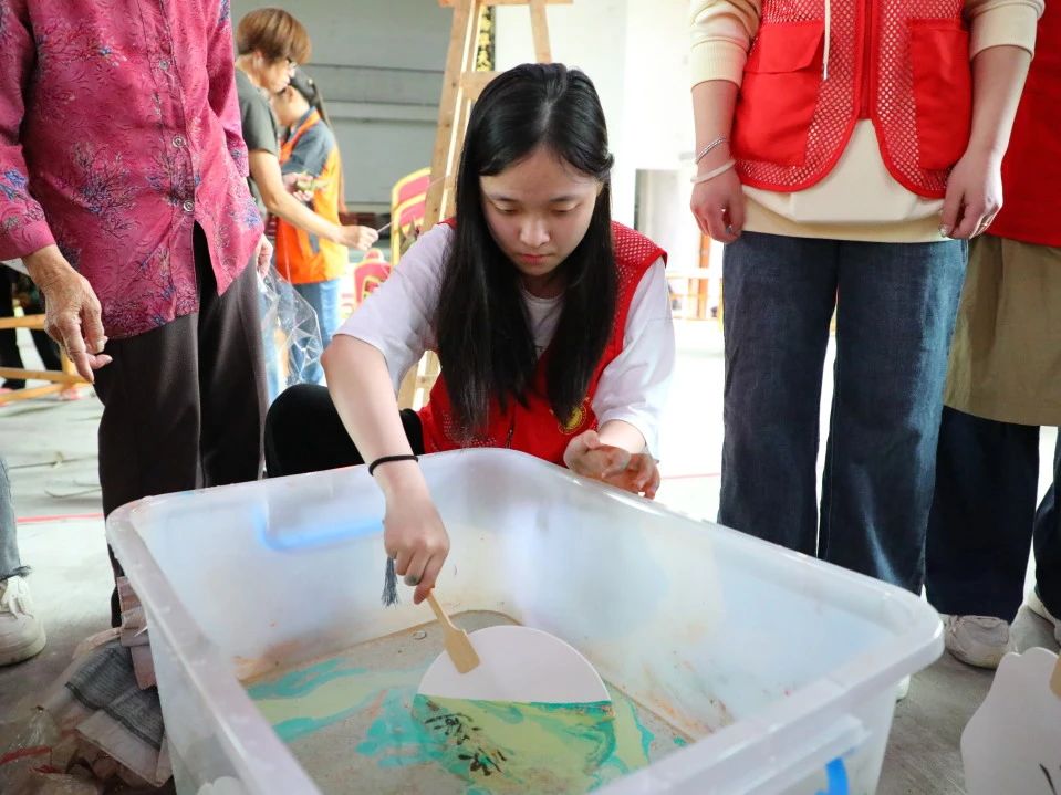 以扇子为载体,运用漆器工艺精心制作而成的艺术品,在水面绘出图案效果,晕染在团扇表面,形成自然天成的图案。其独特的制作技艺和精美的图案设计体现了中华民族的智慧和艺术,在志愿者的指导和协助下,社区居民们纷纷发挥自己的想象力和创造力,在扇面上绘制粽子、龙舟等图案,写下“端午快乐”等祝福语,让社区居民在活动过程中感受中国传统记忆的无穷魅力。