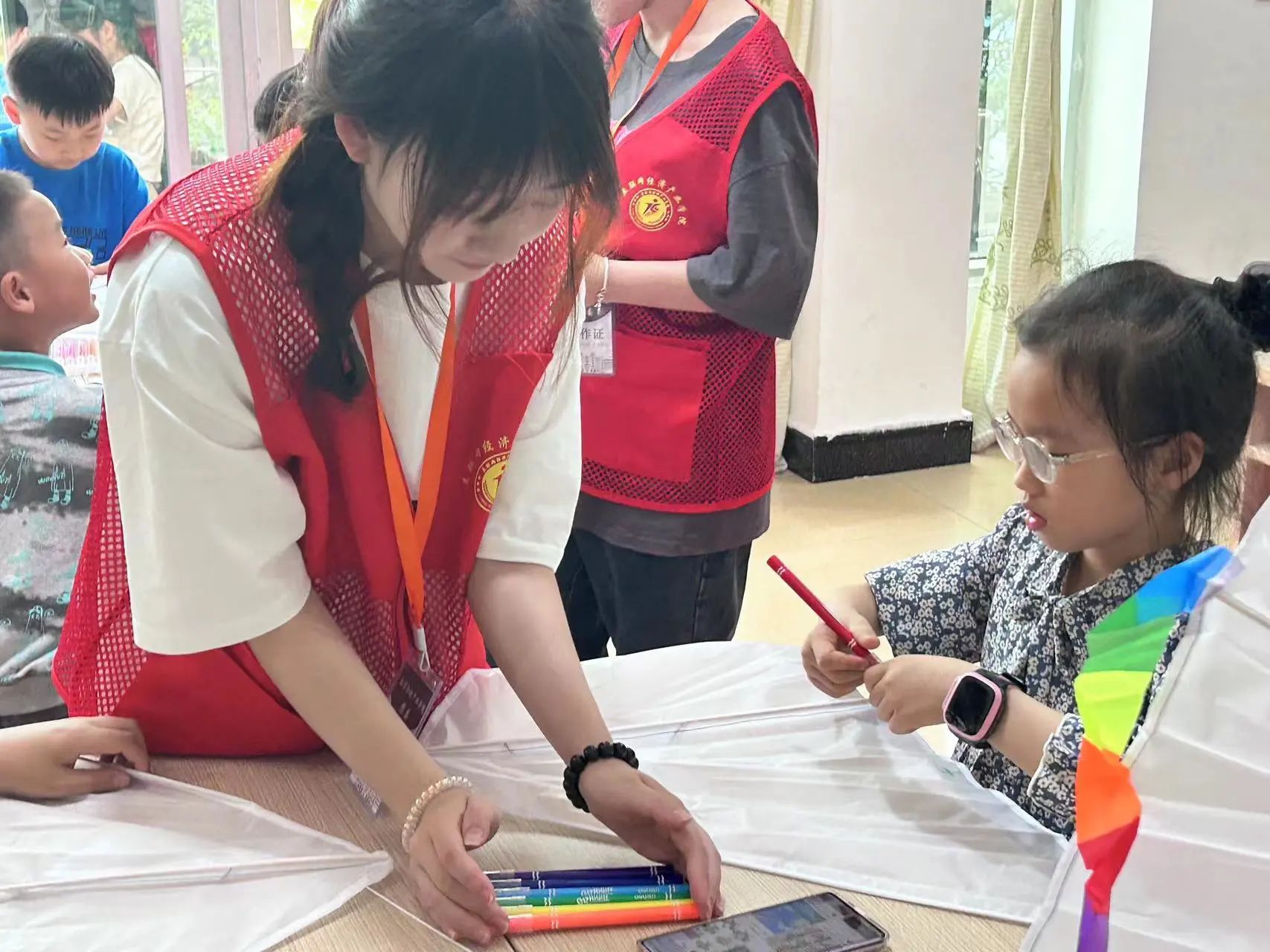 在制作过程中,志愿者们将准备好的风筝和颜料分发给小朋友们,他们拿起画笔自由创作,用五颜六色颜料点缀自己独具创意的风筝作品。一个个各具特色的风筝蕴含着小朋友们对青春和梦想的美好憧憬,用实际行动去传达对未来的殷切。