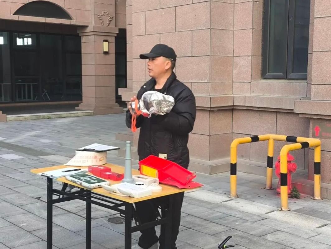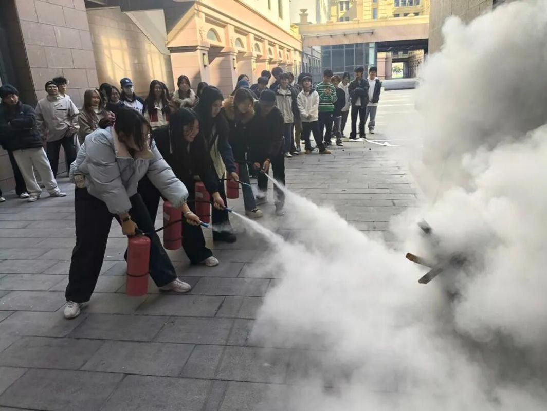 火灾发生时,烟雾大多聚集在上方,低姿前进能减少烟雾吸入。如果没有湿毛巾,用衣物捂住口鼻也能起到一定的防护作用。随后在郭克刚老师的带领下,同学们开展了消防器材使用实操学习。
