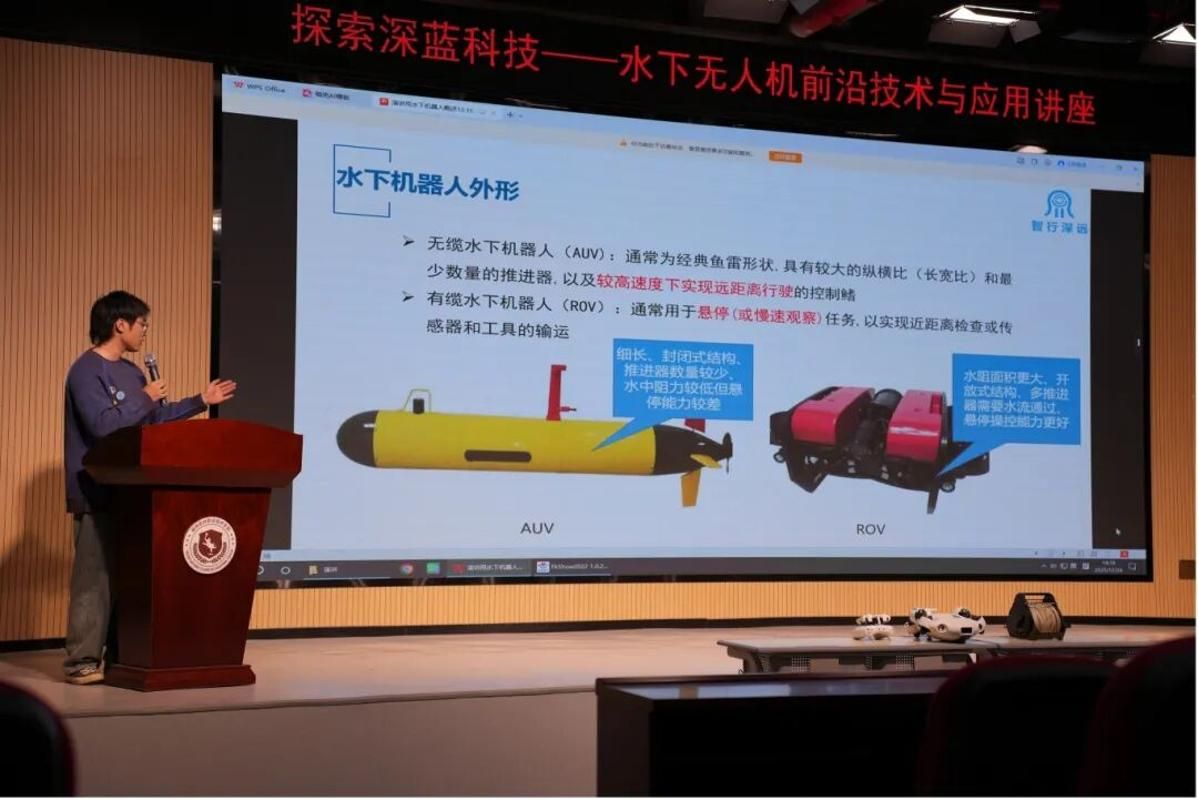 讲座环节在L311报告厅举行,张宏辰专家围绕水下机器人(水下潜航器)核心技术与行业应用展开系统分享。他详细解读了水下潜航器的分类体系,重点介绍了无人潜航器中有缆(ROV)与无缆(AUV)两类产品的技术特性,其中观察级ROV因体积小、成本低、安全系数高的优势,已广泛适配0-500米水下民用场景。同时,专家结合行业案例,阐述了水下机器人在水下构筑物检测、海上风电运维、海洋渔业、应急救援、核电站检测等领域的多元应用,通过对比传统潜水员作业模式,凸显了其在作业效率、数据精准度上的显著优势,让师生对水下智能装备的发展前景有了全面认知。