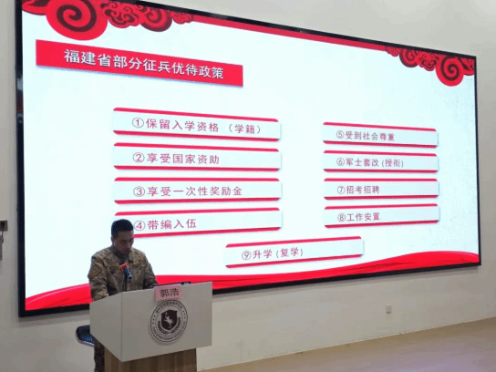 本次活动特邀长乐区人民武装部政工科科长郭浩担任主讲嘉宾,文岭镇人民武装部部长刘春权、干事黄姿楠到场。我校智能建造产业学院党总支副书记张慧、学生工作部(处)学生教育管理科科长蔡悦盛,以及各二级学院征兵负责人共同参加。宣讲会吸引了来自全校各学院的众多学生积极参与。