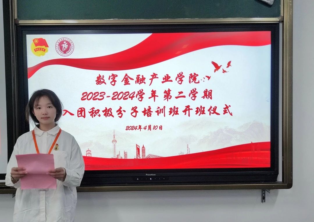 为深入贯彻落实习近平总书记关于加强新时代团员队伍先进性建设的重要指示,全面强化入团积极分子素质,规范发展团员工作,保证新发展团员质量,数字金融产业学院于4月10日在教学楼D213召开2023-2024学年第二学期入团积极分子培训班开班仪式。参与本次开班仪式的有数字金融产业学院团委书记叶雅姿、培训班班主任林宗增、辅导员郑雯、陈雨芯、吴艳文、易星晨、陈晖、张婉珍、李雯及全体入团积极分子,开班仪式由数字金融产业学院团委组织部干事王思滢主持。