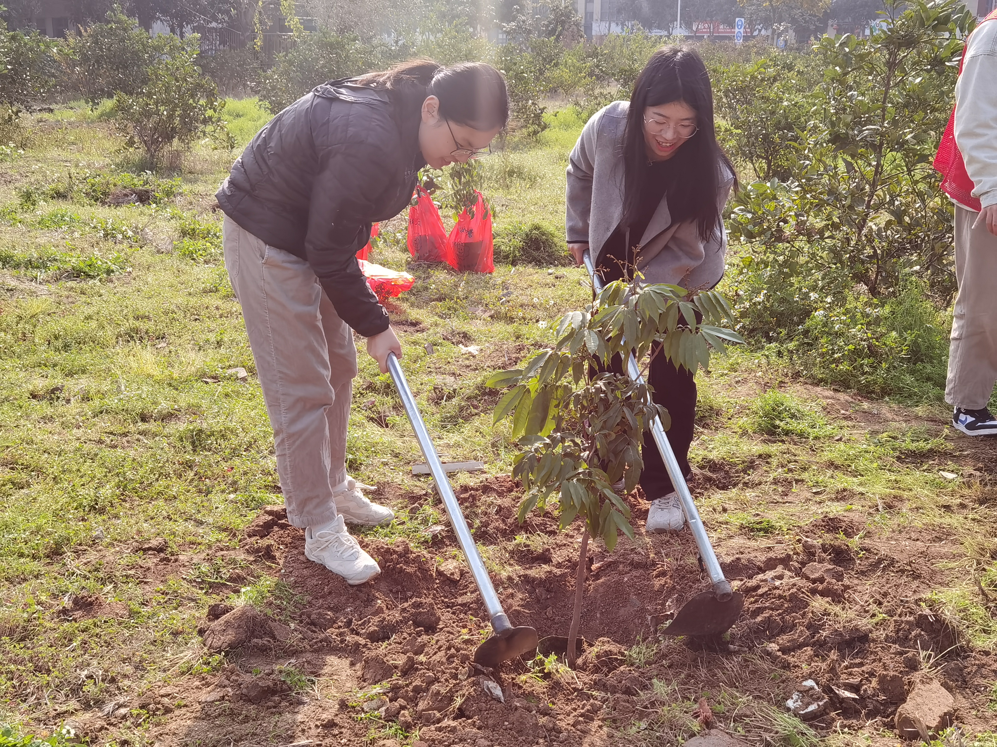 春风十里,不及一抹绿意。植树现场,志愿者们激情高昂,分工明确、干劲十足,挥锹铲土、培土围堰、提水浇灌、扶树正苗…每个环节都井然有序、配合默契。经过志愿者与老师们共同配合,树苗苗基实稳固、盎然挺拔,放眼望去,一片绿意盎然。
