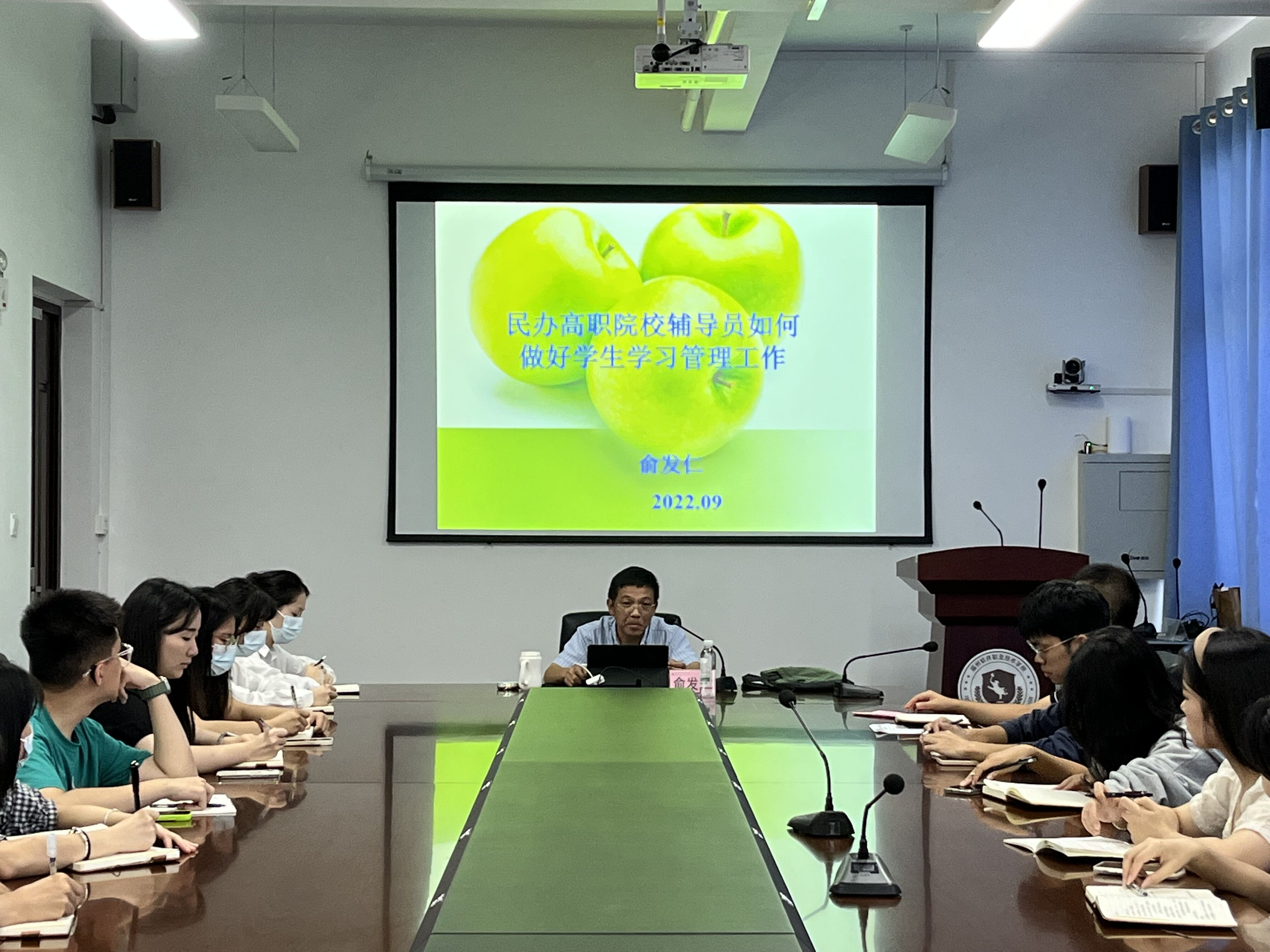 为落实高校辅导员立德树人的根本任务,提升我校辅导员的责任意识、坚定理想信念,9月28日上午10:30,执行校长俞发仁在行政楼208会议室为全体2022级新进辅导员带来了主题为《民办高职院校辅导员如何做好学生学习管理工作》的精彩讲座。校党委副书记林艺勇、学生工作处副处长(主持工作)林海及全体新入职辅导员参加了本次讲座。