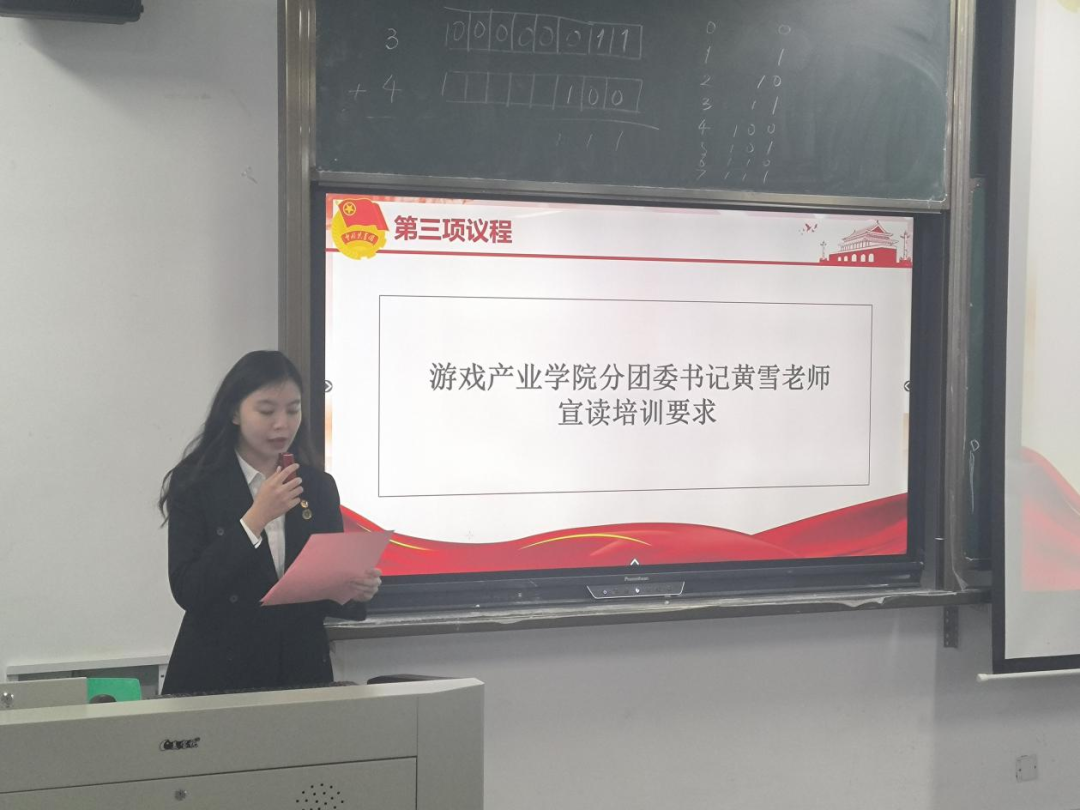 游戏产业学院分团委书记黄雪老师宣读了本期“入团积极分子”培训班纪律条例与培训要求:学员务必按时参与培训,认真听课,做好听课记录和思想汇报,并于课程结束时接受考核。希望各学员认真学习,按时完成学习任务。