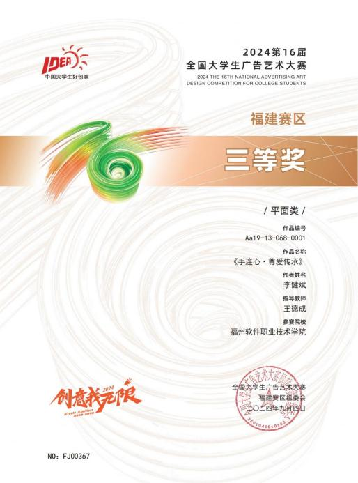 在近期举办的2024第16届全国大学生广告艺术大赛中,我院建筑室内设计专业的教师王德成、林雨欣指导的学生团队荣获福建赛区省级三等奖两项。此奖项的获得,不仅为学院赢得了荣誉,也体现了学院在培养具备创新能力和实践技能人才方面的教学成果。这不仅是对教师们辛勤付出的肯定,更是对学生团队努力拼搏的回报。