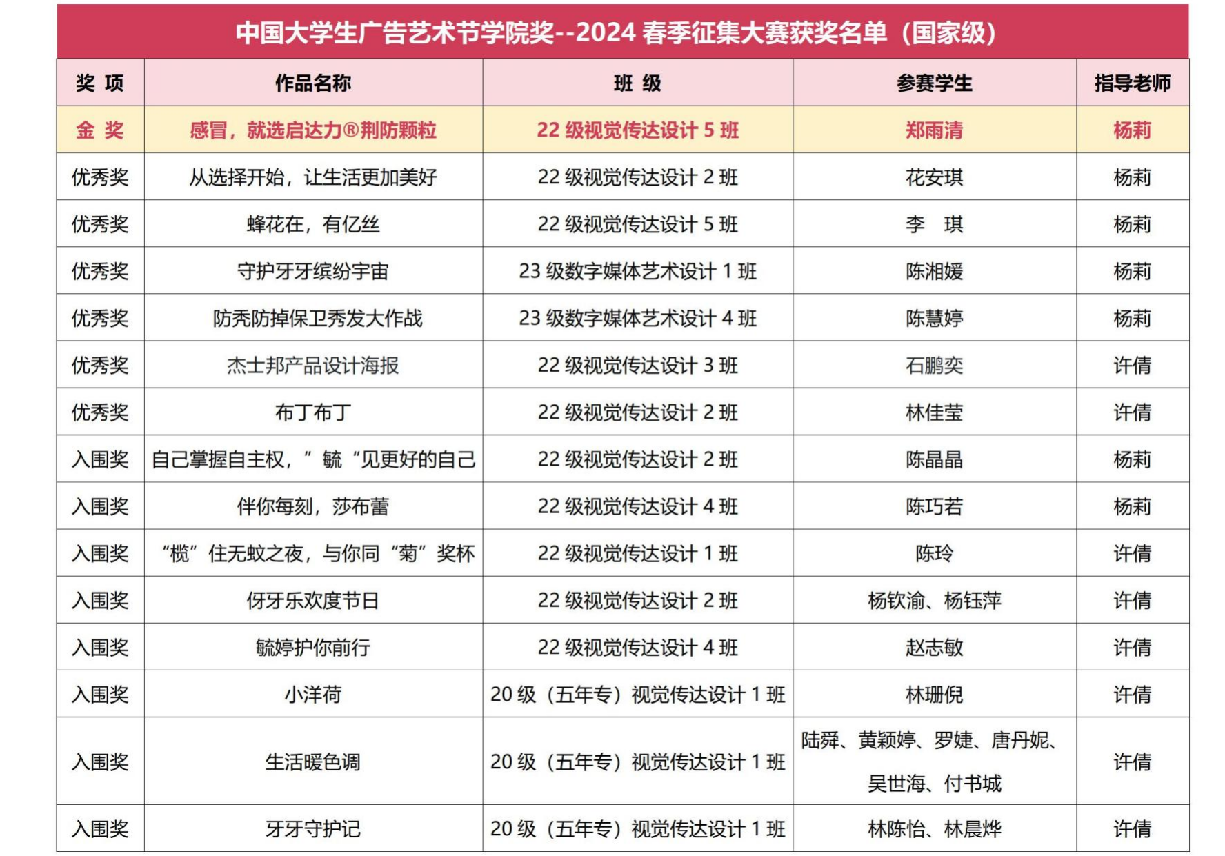 近日,《中国大学生广告艺术节学院奖(2024 春季赛)颁奖礼》在北京广播大厦盛大举行,我院在此次大赛中斩获佳绩,喜获学院奖金奖 1 项,优秀奖 6 项、入围奖 8 项。其中,22 级视觉传达设计五班郑雨清同学在杨莉老师的指导下荣获金奖。