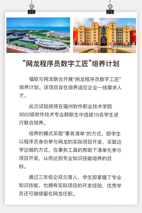 此次试验班是“网龙化数字化工程师”培养计划重要组成部分,将在22级软件技术专业群新生中选拔若干学生进行现代学徒制联合培养。培养采取“事务清单”方式,即学生以程序员身份参与网龙的实际项目开发,采取边学边做方式,在事务工具的帮助下清单化参与项目开发,从而达到专业知识技能培养的目标。
