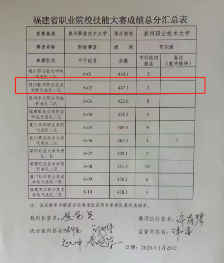 2026年1月26日至28日,2026年福建省职业院校技能大赛财经赛道在泉州职业技术大学圆满落幕。我校数字金融产业学院代表队1队凭借出色的团队协作和稳健的临场发挥,从全省68支参赛队伍中,成功斩获二等奖,充分展现了我校职业教育的丰硕成果。