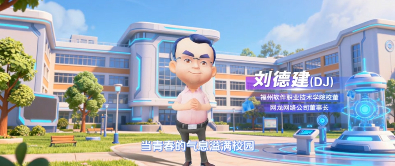 网龙网络公司董事长、学校校董刘德建先生以数字技术穿越时空距离,通过精妙的AI形象现身典礼致辞。