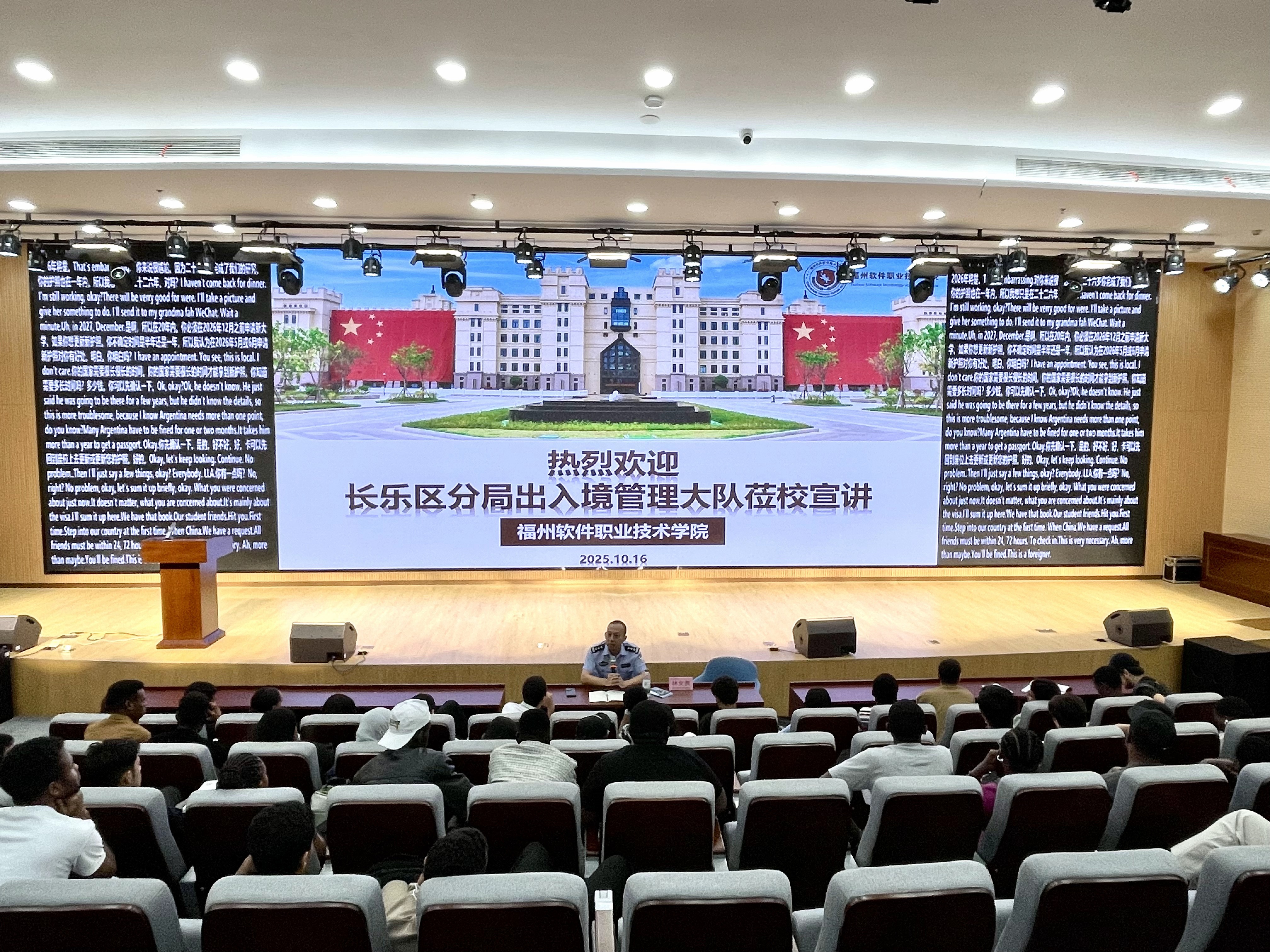 2025 年10月16日上午,我校国际学院特邀福州市公安局长乐分局出入境管理大队林文贵警官莅校开展宣讲活动,为来自21个国家的国际语言生精准解答出入境相关疑问,助力学子安心求学。国际学院相关负责老师及全体国际语言生参加活动。
