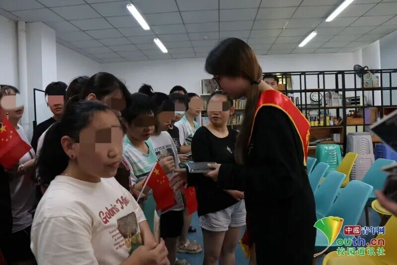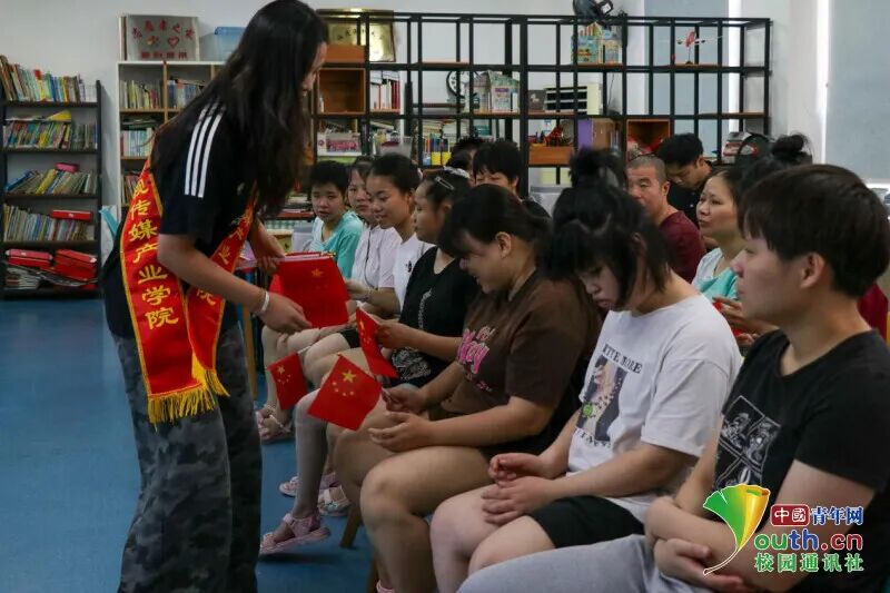 图为志愿者郑窈瑶同学为福利院孩子们发放国旗。吴运生 供图