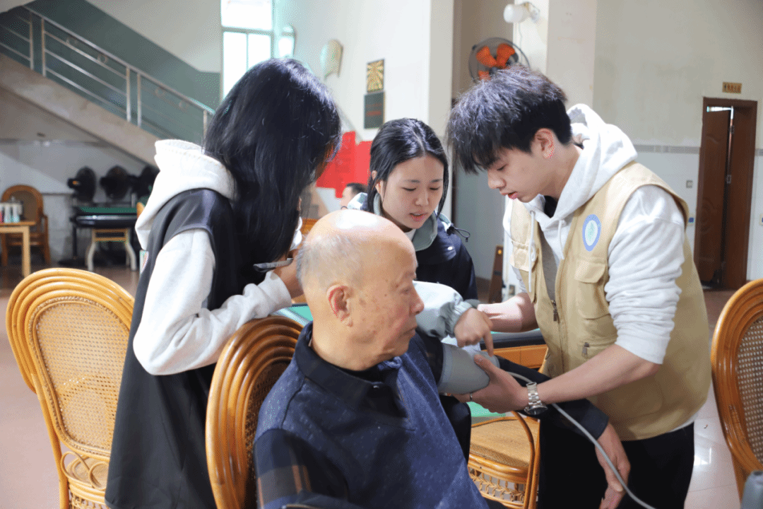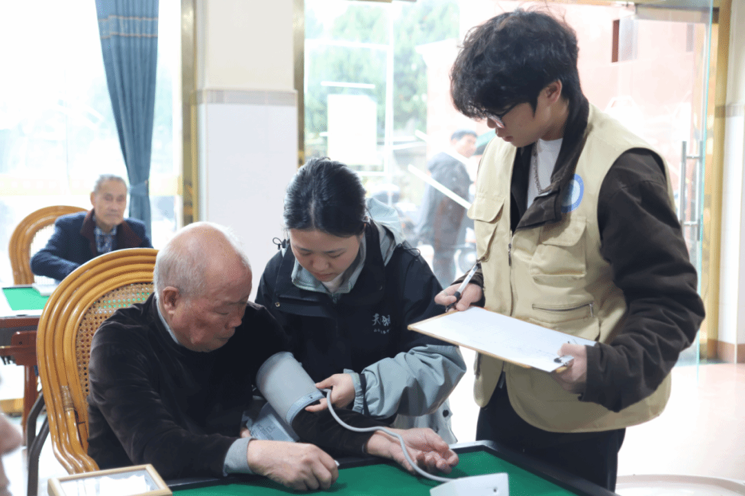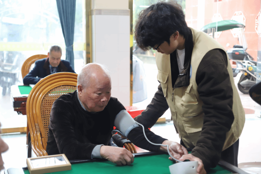 在老年协会活动室中,青年志愿者化身健康守护者,为长者开展血压测量服务。动作轻柔规范,专注记录各项数据,全程细致严谨,以专业守护长者安康。测量期间,青年志愿者俯身与长者亲切交谈,一边有序操作仪器,一边倾听长者心声,关切之语温润人心,叮嘱之言细致入微,于温馨氛围中传递关怀,让健康服务兼具专业力度与人文温度,尽显敬老爱老的真挚情怀。