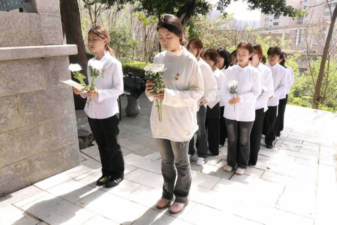 誓词宣读完毕,师生们手捧洁白素雅的菊花,依次缓步走向庄严肃穆的烈士纪念碑,将手中鲜花轻轻安放于碑前,又以轻柔的动作擦拭墓碑上的尘埃,以无声的行动寄托对英烈的深切缅怀与崇高敬仰。