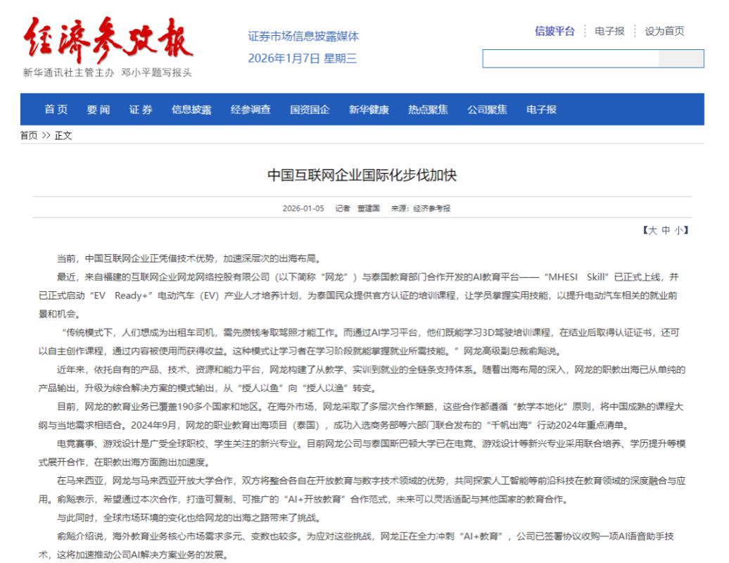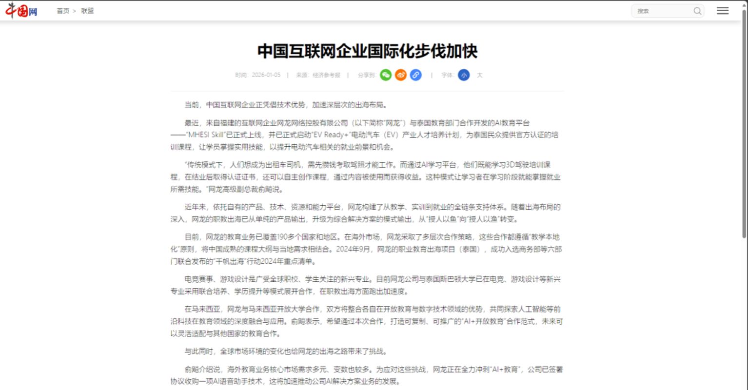 近日,我校理事长、网龙网络控股有限公司高级副总裁俞飚接受新华社独家专访,深度解读学校依托企业办学优势,在职业教育国际化领域的探索实践与创新突破。相关报道在新华社、《经济参考报》、证券时报、中国经济网、光明网等多家全国权威媒体平台刊发,转发的重点媒体超过20余家。