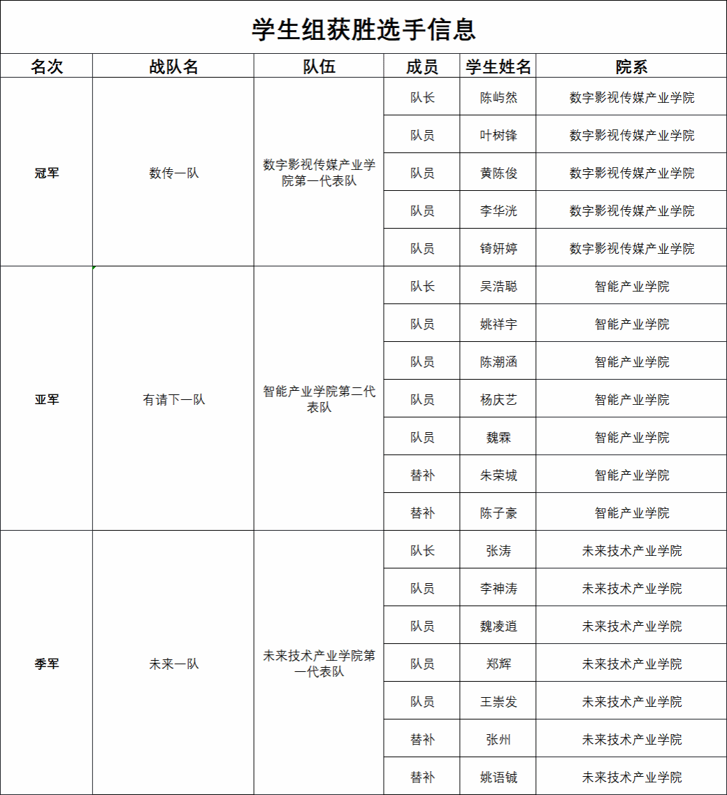 经过精彩角逐,各组优胜队伍脱颖而出。学生组方面,数字影视传媒学院第一代表队“数传一队”凭借出色的战术执行一路过关斩将,荣获冠军;智能产业学院第二代表队“有请下一队”获得亚军;未来技术产业学院第一代表队“未来一队”获得季军。
