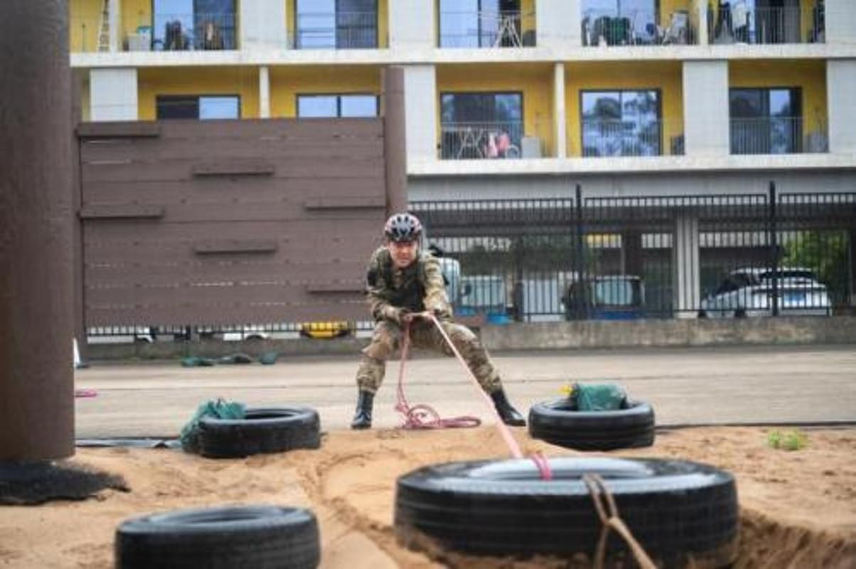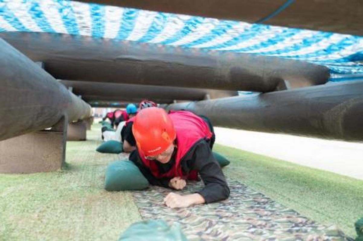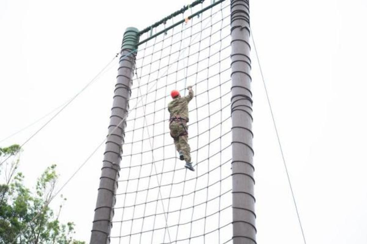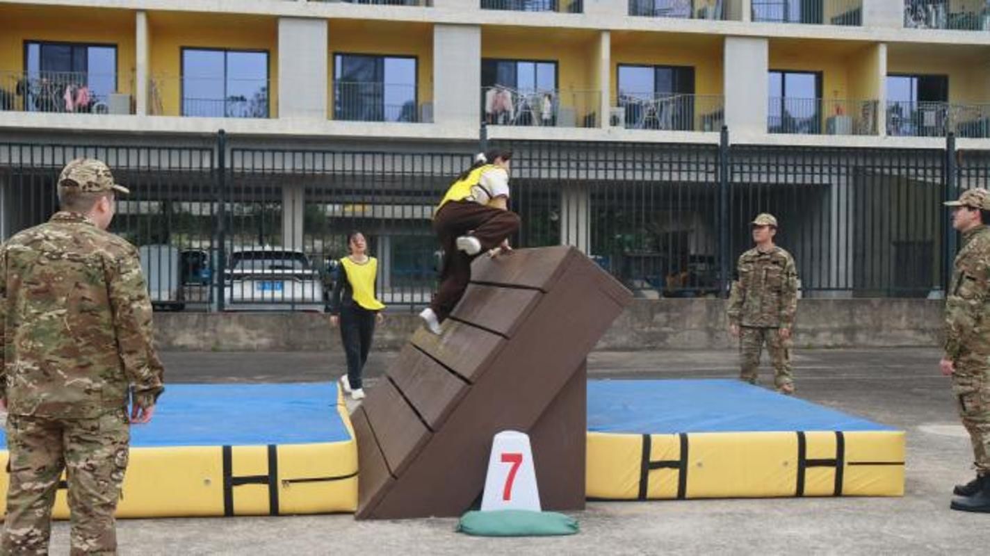 教练带领热身运动及安全讲解后,大家分两组有序体验独木桥、升降物资、射靶心、高空攀爬网等项目。退伍师生主动示范,学生骨干带头尝试,同学们在互助中共同突破。