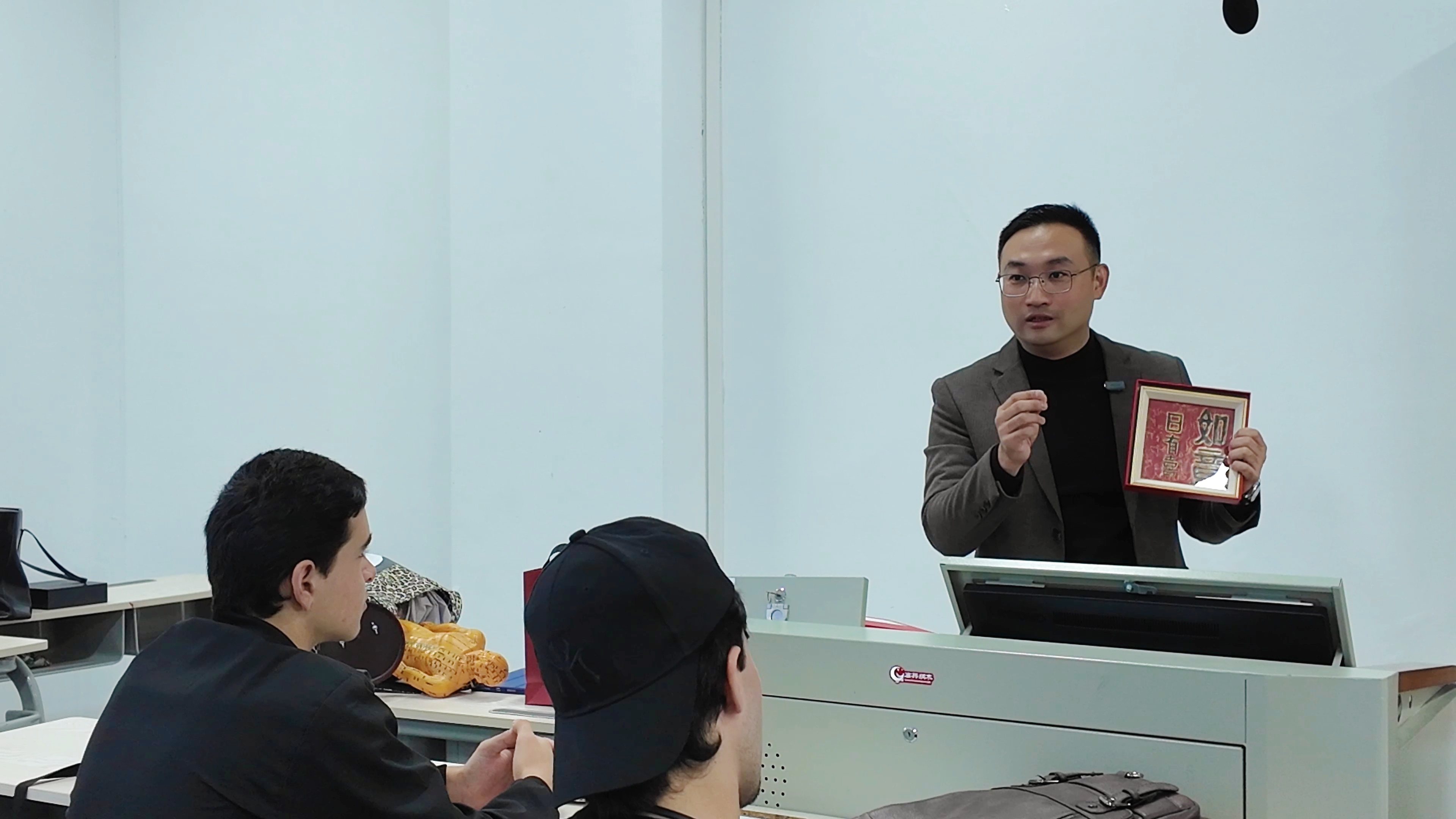 在活动尾声的特别环节中,袁帅老师为三位在互动中表现积极的国际语言学生颁发了非遗漆画纪念品。这份融合传统工艺与现代审美的礼物,不仅是对学生热情参与的嘉奖,更是中华优秀传统文化的一份可触可感的传承,象征着匠心精神在国际语言学生间薪火相传。