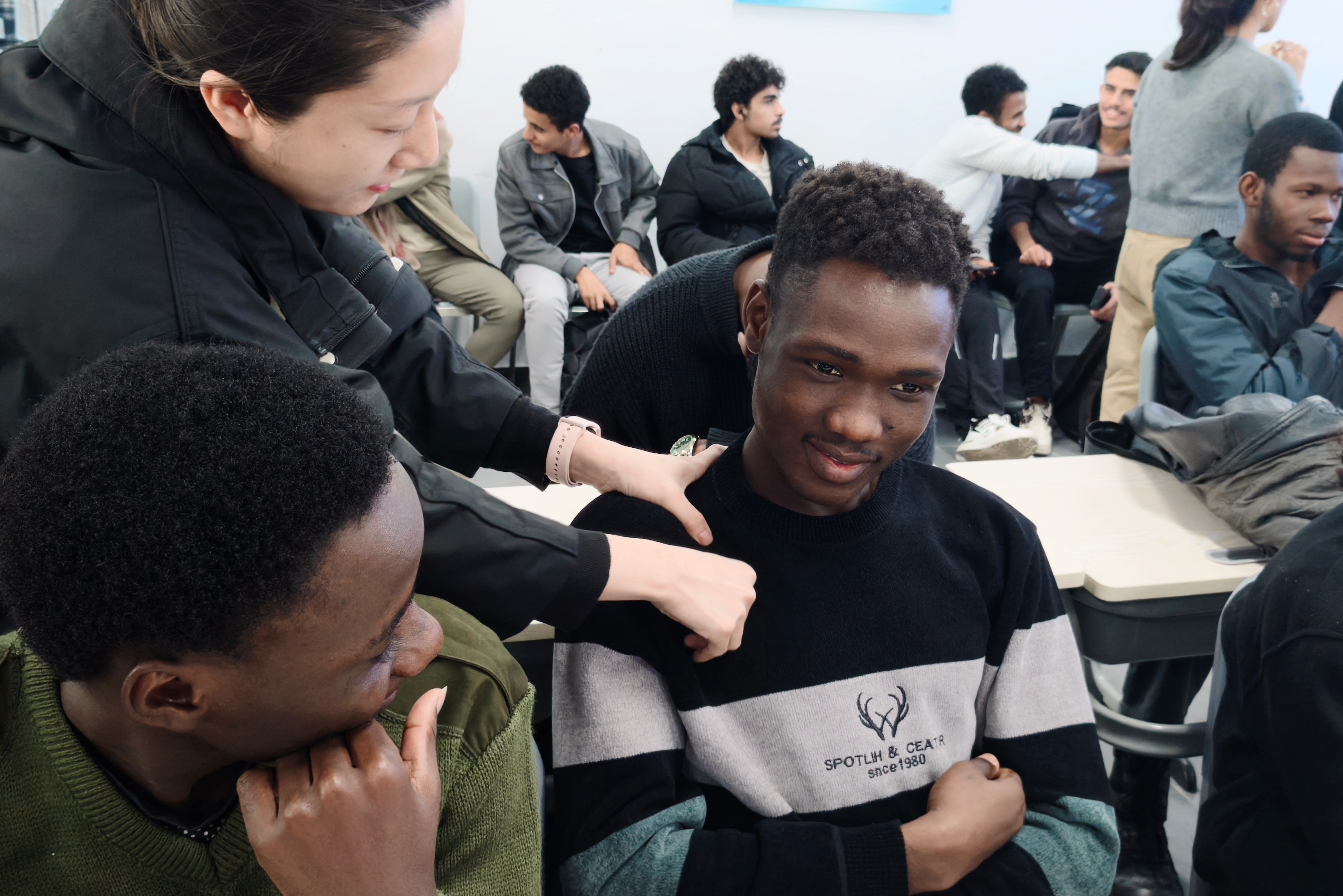 随后,福建省鉴定中心技能人才评价质量督导员、保健按摩考评员卢晓艳携其专业团队,为师生呈现了一场生动且深刻的中医推拿与穴位保健技艺展示。卢老师从中医理论入手,深入浅出地讲解了常见穴位的功效与按摩手法,并在互动环节中指导学生现场体验。国际学生们踊跃参与,在“一对一”实操中切身感受中华传统保健技艺的独特魅力。